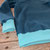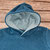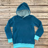Superkuscheliger Kapuzenpulli aus Bio-Baumwollfleece in dunklem petrol. Kapuzenfutter aus Baumwolljersey. Bündchen türkis geringelt.