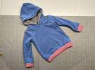 Kapuzenpulli aus blauem Alpenfleece. Kapuzenfutter aus kuscheligem Baumwollfleece. Bündchen rot geringelt.